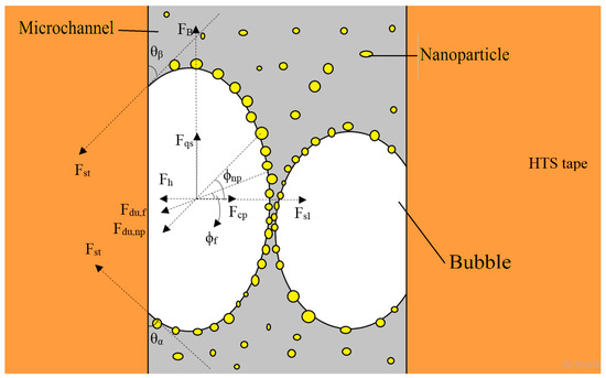 The NP effect on physical properties of a bubble’s surface, such as in Figure 1, can create a significant impact on thermal behaviors of LN2. Building upon this literature, this paper focuses on investigating the impact of nanoparticles on the NBHTC in a practical model rather than the sample models examined in previous research. Furthermore, the study explores the effect of nanoparticles on bubble behavior in conjunction with their direct impact on nucleate boiling heat transfer. This approach helps identify various challenges and benefits, with one of the most significant issues being the potential blockage of HTS transformer microchannels by coalescing or overgrown bubbles. Additionally, the mechanism by which nanoparticles affect the NBHTC during very short periods (<100 ms) is also investigated.