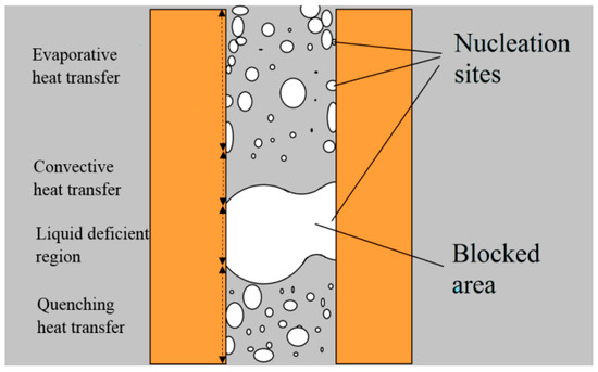 While bubbles significantly enhance the heat transfer coefficient, their coalescence can disrupt heat transfer in the microchannels. Bubble coalescence creates a blocked area inside the microchannels, which prevents other bubbles from being conveyed outside. The schematic of bubble creation and their coalescence is shown in Figure 5.