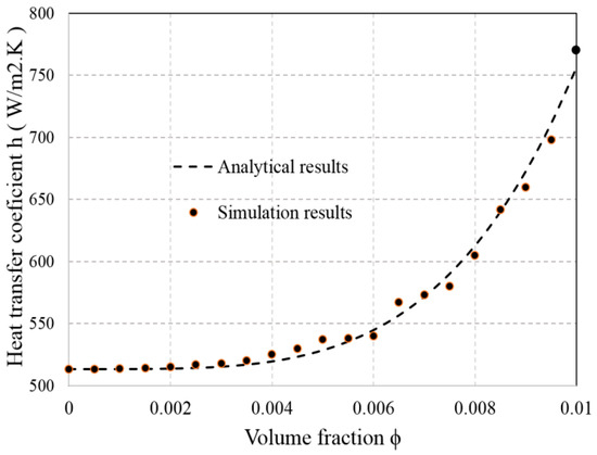 Impact of Al2O3 nanoparticle VF on the HTC: comparison between analytical results and simulation results.