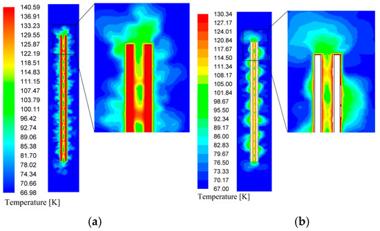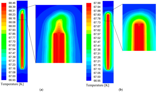 The temperature distribution on the tapes in a steady state is depicted in Figure 9. Comparing Figure 9a,b reveals that adding nanoparticles to LN2 decreases the natural flow of LN2. This flow is driven by the dependence of LN2 density on temperature and is directed opposite to gravity. This phenomenon can be explained using Equations (8) and (11).