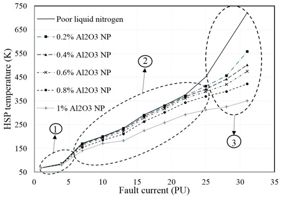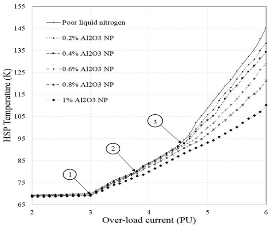The hotspot temperature of the tapes for different currents is illustrated in Figure 10. In this figure, point (1) represents the critical current point of the YBCO tapes, point (2) indicates the saturated temperature of LN2, and point (3) denotes the critical temperature of YBCO.