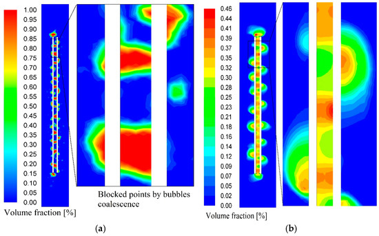 The coalescence of bubbles can create blocked areas inside the microchannels, disrupting the cooling performance of LN2. Bubble coalescence depends on several parameters, including bubble diameter, surface tension, and bubble break-up frequency, all of which change when NPs are added. These changes occur due to the forces that bring particles into the bubbles. Figure 11 shows the bubble density inside the microchannel with pure LN2 and LN2 containing 1% Al2O3 nanoparticles with a 40 nm diameter. As shown in this figure, the blocked points caused by large bubbles are completely removed in Figure 11b compared with Figure 11a. This results in a reduction in bubble size and bubble coalescence frequency. The effect of the reduction in the VF of bubbles on the temperature distribution is shown in the following section.