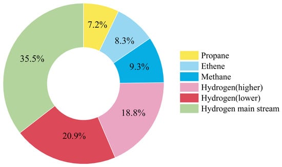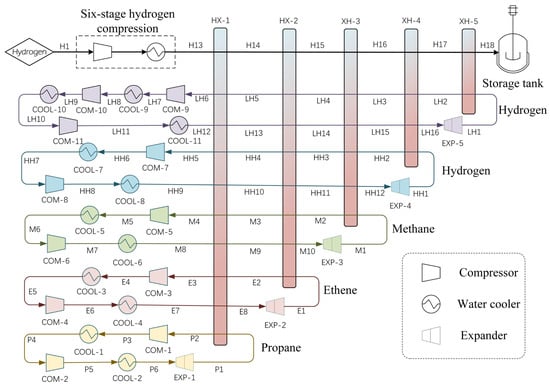 In the compression process, the feed hydrogen (30 °C, 102 kPa) goes through six consecutive compression-cooling processes, and the pressure reaches 18,000 kPa and the temperature is normal temperature. The cascade structure is set to provide cooling capacity for the cooling process, with each stage of the refrigeration cycle being a Joule–Brayton cycle. Propane, ethene, and methane are the refrigerants in the first three stages of the cycle, and in the last two stages of the cycle it is hydrogen, which gradually reduces the temperature of the mainstream hydrogen to −223.15 °C.