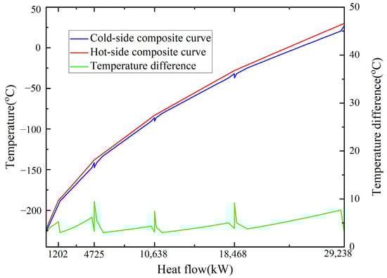 The thermal composite curve can be used to evaluate the efficiency of the heat transfer process. It is widely used as a thermodynamic graphical tool. Generally, the closeness of the cold and hot side curves represents the performance of the heat exchanger. Figure 5 is composed of the composite curves of five multi-stream heat exchangers, which makes it easy to compare the performance of all heat exchangers. The heat transfer temperature difference in each heat exchanger shows a decreasing trend during the heat transfer process. In general, the cold-side composite curve and hot-side composite curve fit well, indicating that the heat exchanger performance is good.