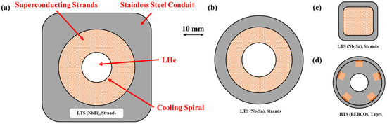 Figure 1. Cross-section of several conductors designed in the ITER: (a) PF of the ITER; (b) TF of the ITER; (c) CC of the ITER; (d) CICC for High-Temperature Superconducting (HTS) by ENEA (Note: this conductor is shown for comparative purposes as an example of next-generation HTS technology).