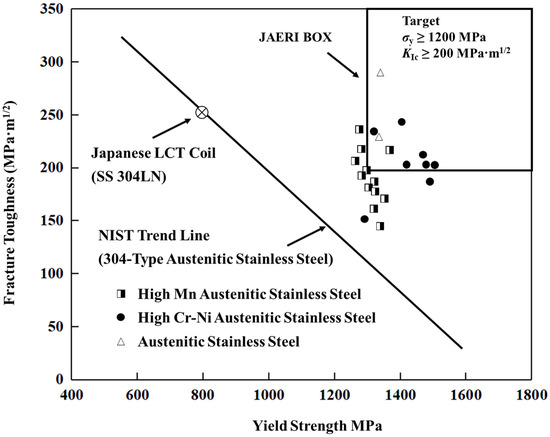 The CS coils critical for plasma current induction and shaping in tokamaks demand jackets that can balance cryogenic strength, fatigue resistance, and dimensional stability under extreme cyclic loading. In response to these stringent demands, the Japan Atomic Energy Agency (JAEA) and Kobe Steel developed JK2LB steel, a low-carbon, low-boron, nitrogen-strengthened ASS (0.03C-22Mn-13Cr-9Ni-1Mo-0.24N-B), as a superior alternative to conventional 316LN steel. Its reduced thermal shrinkage (0.21% vs. 0.29% for 316LN) provides critical thermal compatibility by minimizing compressive stresses on the brittle Nb3Sn strands during cooldown and operation [43,44,45,46]. The mechanical performance of JK2LB at 4.2 K is profoundly influenced by its thermal-mechanical processing history. While cold working prior to heat treatment could enhance subsequent precipitation hardening (18.5% cold working increasing Rp0.2 from 1007 MPa to 1442 MPa but reducing KIc from 144.1 MPa·m1/2 to 52.3 MPa·m1/2 [47,48]), specific optimized heat treatments (570 °C for 250 h and 650 °C for 100 h) have been developed to maintain high ductility (e > 30%) without decreasing strength [49]. This tailored approach was underpinned by microstructural optimizations, including reduced carbon (<0.03%) and controlled nitrogen (~0.2%) content, which suppressed detrimental chromium carbide (Cr23C6) precipitation and mitigated aging-induced embrittlement [50,51]. As a result, even after compaction and aging treatments, JK2LB maintains a Rp0.2 exceeding 850 MPa and KIc above 130 MPa·m1/2 [47,49,50,51,52,53,54,55]. Moreover, JK2LB ensured functional reliability through its antiferromagnetic behavior below 240 K, which guaranteed compatibility with high superconducting fields. JAEA implemented a rigorous non-destructive examination (NDE) regime for jackets of CS coils to ensure the integrity of the manufactured jackets against even minuscule defects that could initiate fatigue cracks under 60,000 operational cycles [56]. NDE system employs two complementary techniques: Eddy Current Testing (ECT) for detecting surface flaws on both the inner and outer jacket surfaces, and Phased Array Ultrasonic Testing (PAUT) for identifying embedded volumetric defects. The inspection criteria are based on a linear elastic fracture mechanics (LEFM) analysis, setting the maximum allowable defect size at 2 mm2 for surface flaws and between 5 and 7 mm2 for internal defects, depending on their location. NDE has been successfully validated on over a thousand jacket sections, demonstrating the capability to reliably detect critical flaws and ensuring the functional reliability of every production unit [57]. Together, these excellent thermal and mechanical properties establish JK2LB as a comprehensively engineered ASS capable of meeting the integrated demands of CS coil operation.