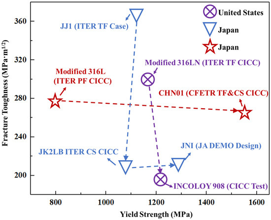 Figure 4. Relationship between fracture toughness and yield strength at 4.2 K of structural steels developed by the United States, Japan and China. (Note: direction of the dotted arrows represents the progression of development time).