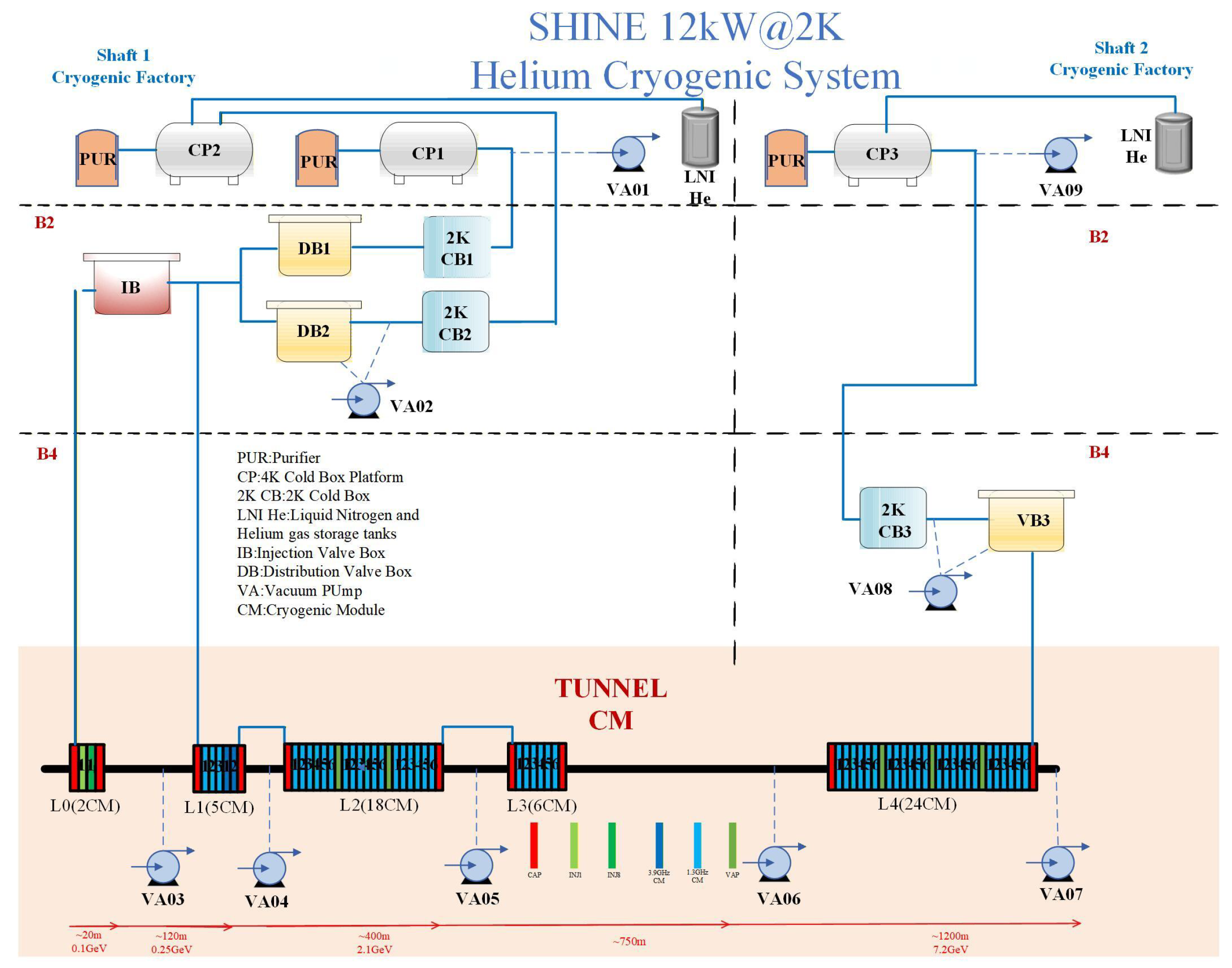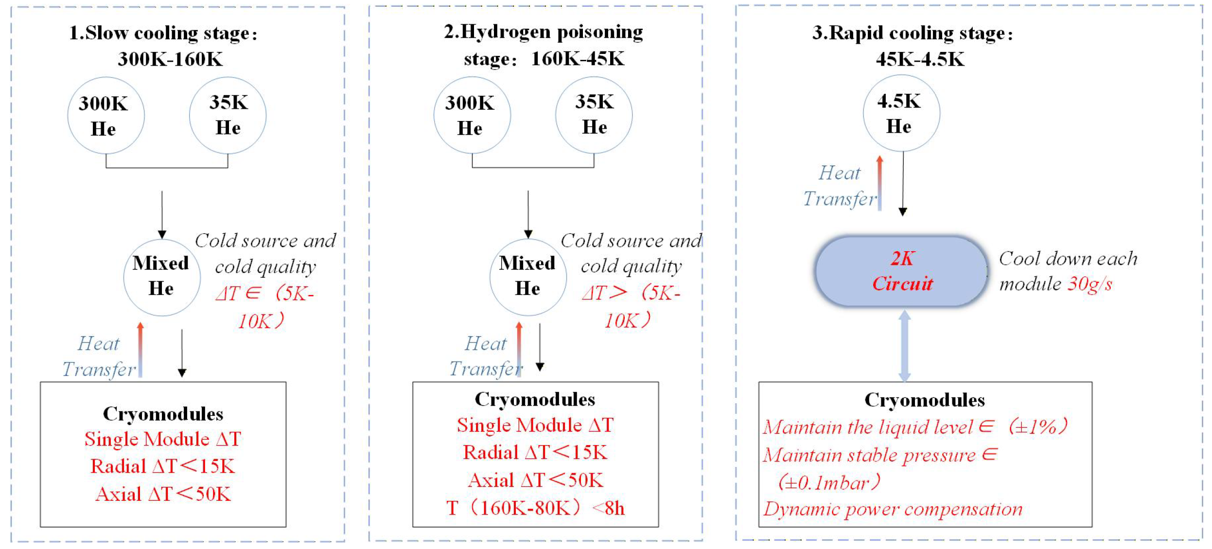 - Stage 4 (4.5 K–2 K): Pressure reduction cooling to achieve the 2 K superconducting state for experimental operation.
