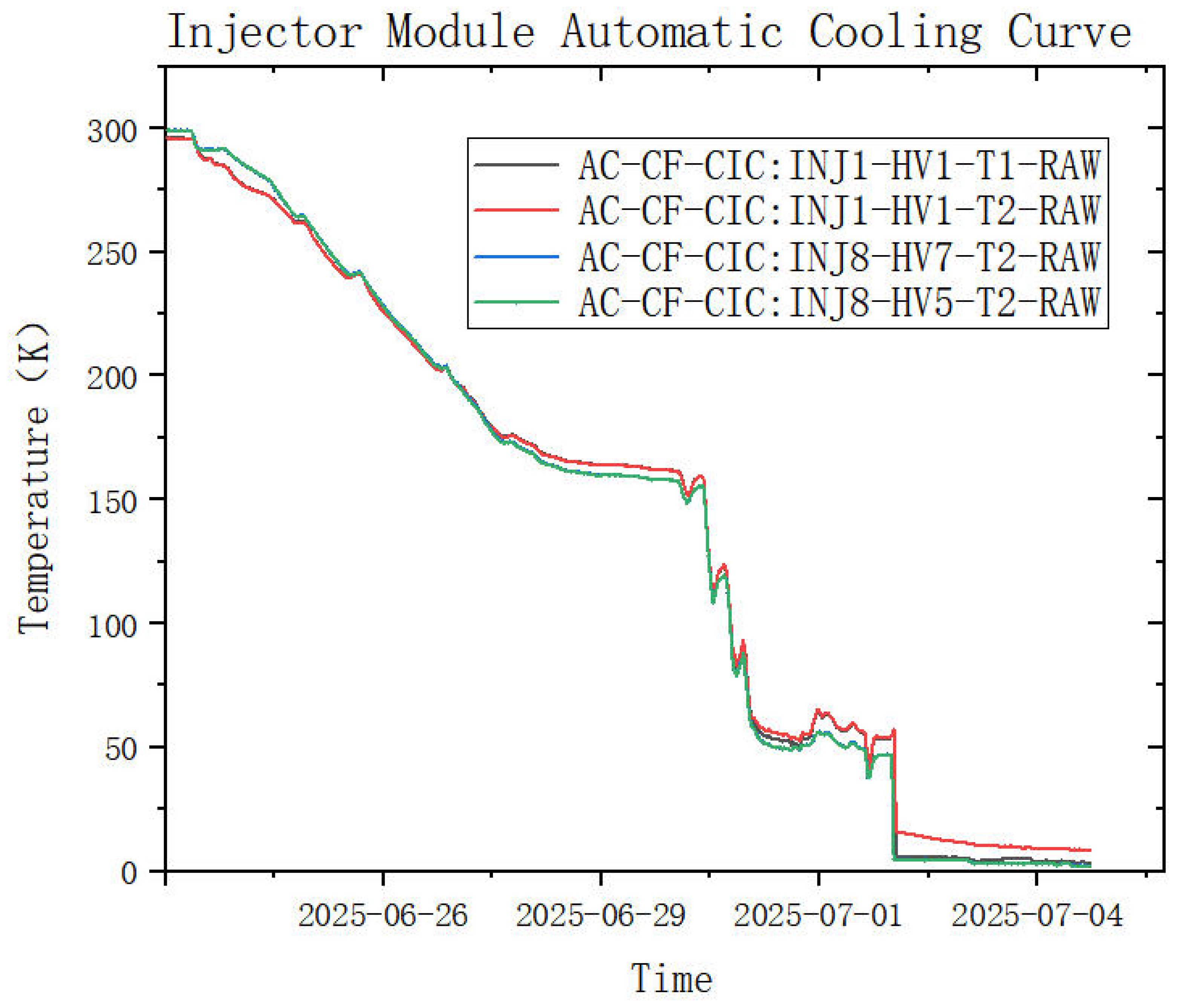- 4.5 K–2 K: J-T valve and cryopump control rapid uniform cooling to 2 K, maintaining liquid level stability. From 24 November to 20 December 2024, the injector section underwent a new round of superconducting cavity cooling tests. Automatic valve adjustment based on pressure and temperature achieved reliable cooling. The 300–45 K automatic cooling process met module requirements, with the complete cooling curve shown in Figure 10. The entire process took approximately 42 h, with a smooth curve validating the system’s effectiveness.