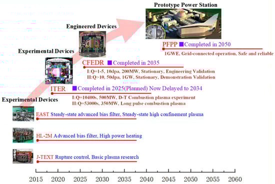 China has established a comprehensive, phased roadmap for the development of magnetic confinement fusion energy. This strategy outlines a clear, multi-stage progression. It begins with fundamental experimental platforms, advances to engineering test reactors, and culminates in a commercial demonstration power plant, as shown in Figure 1 [10]. This strategy aligns with global fusion initiatives but features distinct milestones, especially centered around the EAST, CFEDR, and future demonstration reactor programs [11,12].