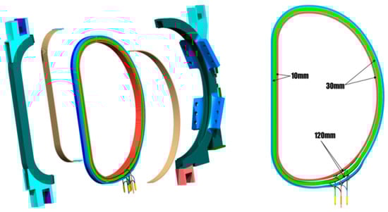 - Vieira, R.F.; Arsenault, D.; Barnett, R.; Bartoszek, L.; Beck, W.; Chamberlain, S.; Cheng, J.L.; Dombrowski, E.; Doody, J.; Dunn, D.; et al. Design, fabrication, and assembly of the SPARC toroidal field model coil. IEEE Trans. Appl. Supercond. 2024, 34, 1–15. [Google Scholar] [CrossRef]