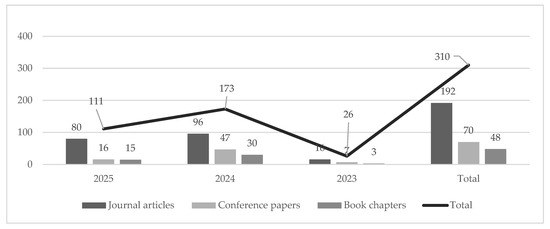 The search was conducted on 1 June 2025, and of the total of 359 research outputs, 310 published between 2022 and 2025 (Figure 3) were selected for analysis after screening. There were 192 journal articles (62%), 70 conference papers (23%), and 48 book chapters (15%).