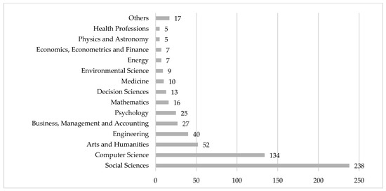The research outputs belonged to 23 different disciplines (Figure 4). The top five disciplines were Social Sciences (n = 238), Computer Science (n = 134), Arts and Humanities (n = 52), Engineering (n = 40), and Business, Management, and Accounting (n = 27). It is worth noting that some outputs are classified as multidisciplinary (n = 4) and assigned to multiple discipline categories, which may potentially affect the accuracy of the distribution count [24].