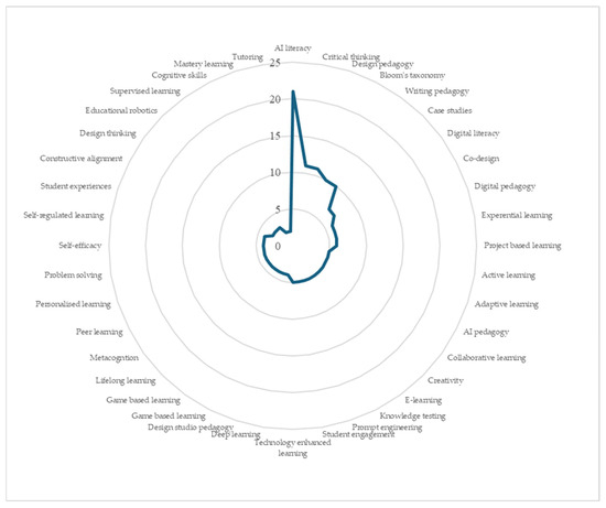 Keywords associated with pedagogical approaches (n ≥ 2) were extracted from the list generated by VOSviewer. A total of 40 pedagogical approaches were detected, and MS Excel was utilised to create a radar map (Figure 7). The top five approaches, based on occurrence, were: (i) AI literacy (n = 21), Critical thinking (n = 11), Design thinking pedagogy (n = 11), Bloom’s taxonomy (n = 10), and Writing pedagogy (n = 10).