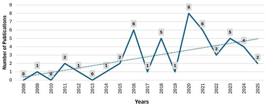 Over time, bibliometrics became a common practice within universities for measuring research impact at both national and international levels [,]. The increasing significance of this field is noticeable in the scholarly literature that explores academic institutions through a bibliometric lens. To illustrate this, we conducted a targeted search in the Scopus database using the query [TITLE (“university” OR “academic institutions”) AND TITLE (“scientometrics” OR “bibliometrics”)], which resulted in a focused collection of 54 documents published between 1987 and 2025. Figure 2 presents the research activity on this topic over the past fifteen years (2008–2025). Although the dataset is intentionally narrow and exhibits considerable yearly fluctuations, it effectively highlights a burgeoning dialog on this topic within the academic community. The overall trend, despite its variability, indicates an increasing interest over the last seven years. This brief exploration does not aim to provide a comprehensive statistical analysis, but rather to highlight that the application of bibliometrics to universities is an active area of research.