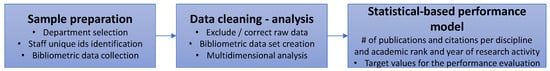 The proposed methodology consists of three stages (see Figure 3). The first stage involves the collection of specific bibliometric indicators for a large sample of faculty staff from universities across Greece. The bibliometric data were gathered from Google Scholar (GS) and Scopus (SC) citation indexes, based on the researchers’ unique identifiers. It is noted that due to the absence of a national centralized system for unique IDs and the limited use of ORCID accounts, this identification process was conducted manually, demonstrating the dedication and effort put into the research. To assure data reliability, a multi-step verification protocol was established, addressing a common challenge in large-scale bibliometric studies []. More specifically, each researcher was identified by cross-referencing their name, affiliation, and field of study across official university websites, Google Scholar, and Scopus. Following this, each profile match was independently assessed by a second team member to verify its accuracy, with any discrepancies resolved through consensus. Moreover, to guarantee a representative sample of faculty staff, several academic departments from diverse scientific disciplines and various regions of the country were selected. Once the researcher’s list was finalized, the Publish or Perish tool [] was utilized to extract the bibliometric indicators (see Table 1) from the citation indexes (Google Scholar and Scopus).