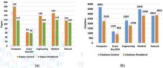 (a) Average number of papers—GS1. (b) Average number of citations—GS2 (per discipline).