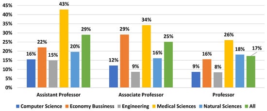 The most significant reduction between the initial and final sample (−43%) was observed among the academic staff in the field of Economics/Business Sciences/SSH. It is essential to clarify that the observed data omission was not random but rather a systematic phenomenon. Analyzing the data presented in Table 2 reveals that the exclusion rates were relatively consistent across academic ranks, with 49% of Assistant Professors, 41% of Associate Professors, and 40% of Full Professors being excluded. This indicates that the absence of a profile for Economics/Business/SSH population is not strongly linked to seniority. The primary reason for this weakening was the lack of publicly available Google Scholar or Scopus profiles, which aligns with the well-documented limitations in the representation of these disciplines within major citation databases [].