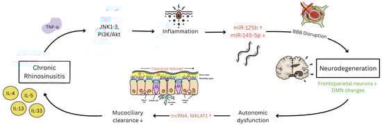 Current established molecular and post-translational pathways between CRS and neurodegeneration. ↑ indicates upregulation while ↓ indicates downregulation. Legend. TNF-α: tumor necrosis factor-alpha; JNK: c-Jun N-terminal kinase; PI3K/Akt: phosphatidylinositol 3-kinase/protein kinase B; miR-125b: microRNA-125b; miR-145-5p: microRNA-145-5p; BBB: blood–brain barrier; DMN: default mode network; lncRNA: long non-coding RNA; MALAT1: metastasis-associated lung adenocarcinoma transcript 1; IL-4: interleukin-4; IL-5: interleukin-5; IL-13: interleukin-13; IL-33: interleukin-33.