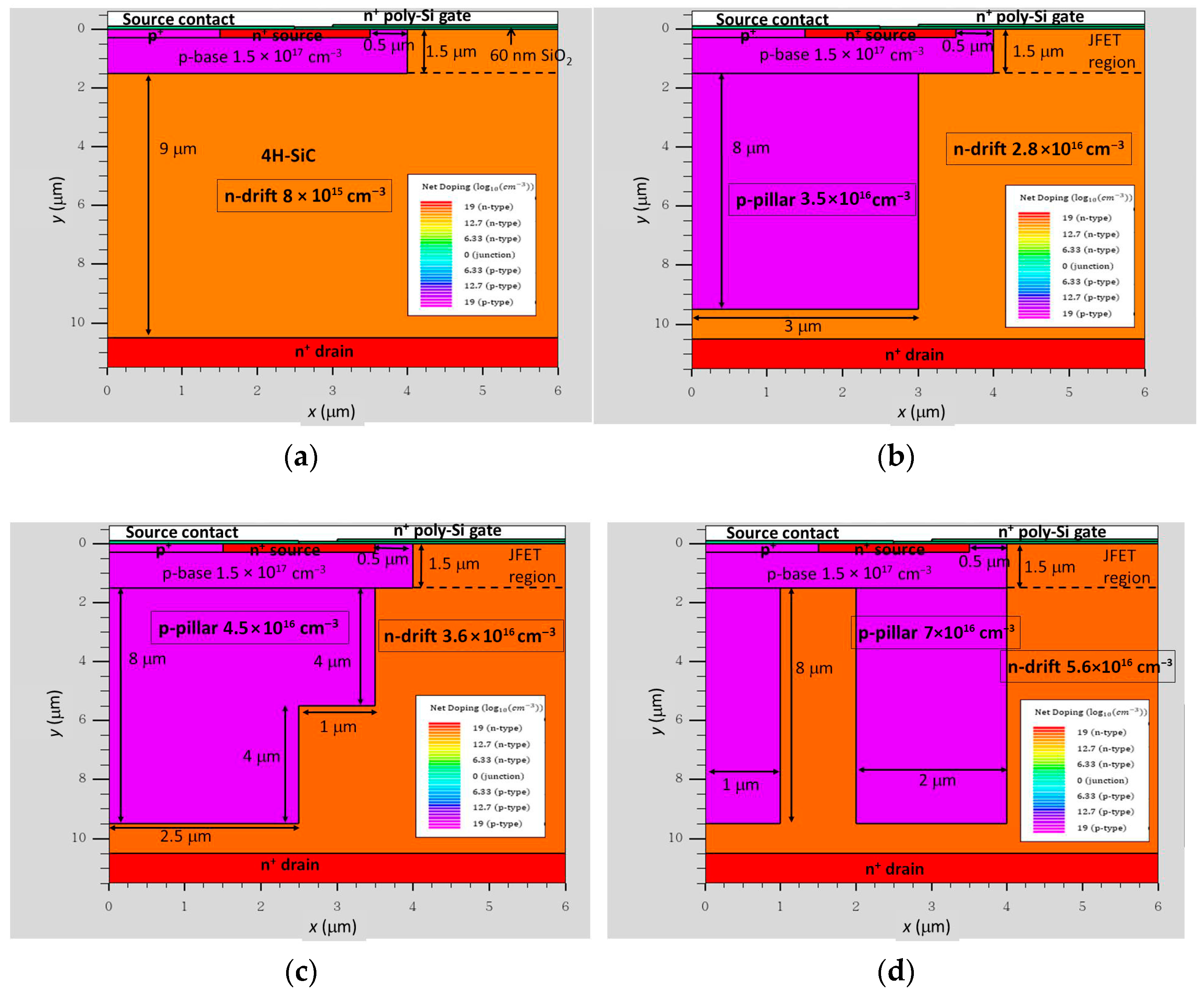 - Guo, X.; Tian, X.; Bai, Y.; Lei, T.; Han, Z.; Song, G. Simulation study on super-junction SiC MOSFET with different PN pillar numbers. In Proceedings of the International Conference on Electron Devices and Solid-State Circuits (EDSSC), Xi’an, China, 12–14 June 2019. [Google Scholar] [CrossRef]