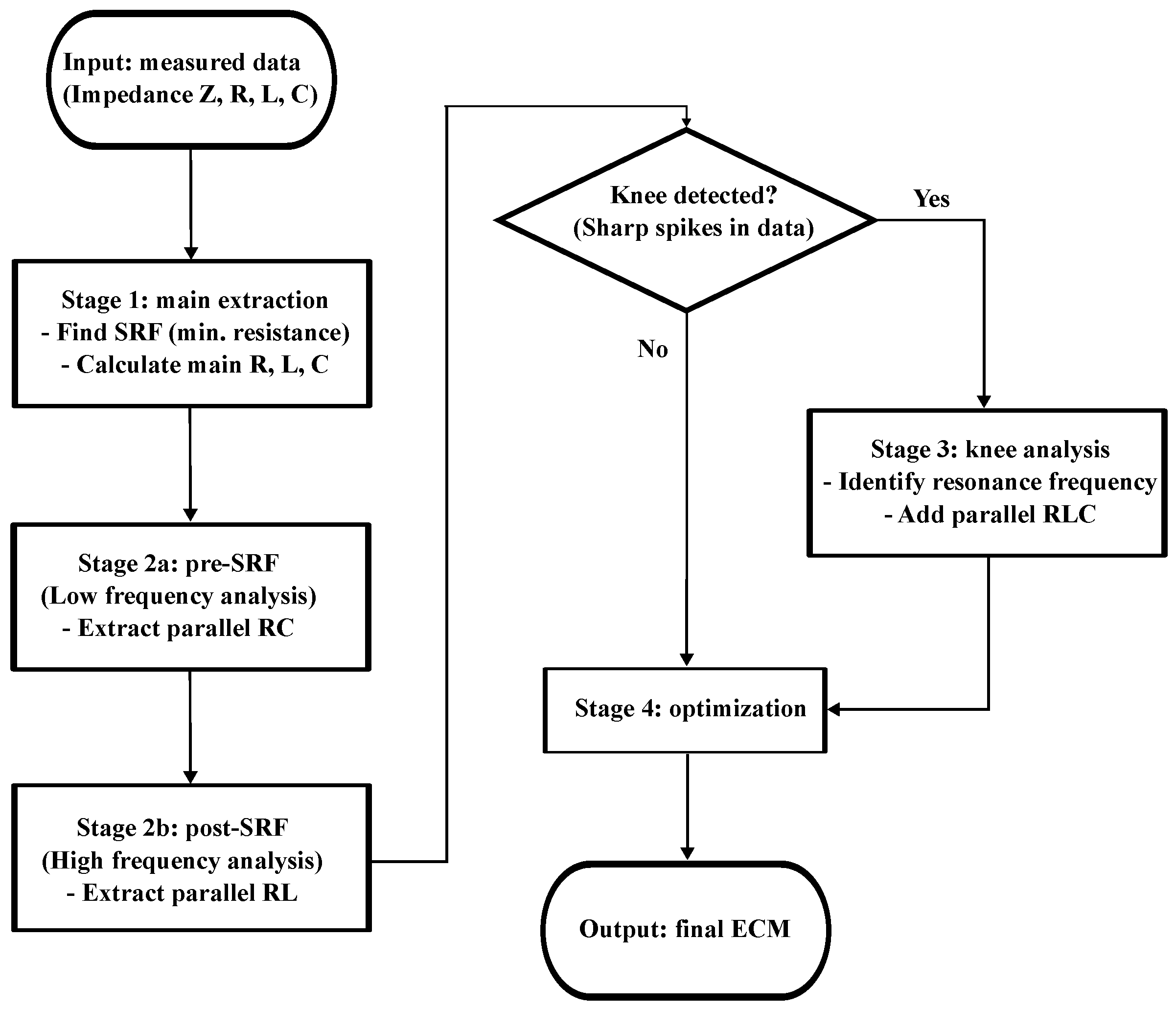 Figure 3. This flowchart illustrates the sequential decision-making process, ensuring that each parasitic element is isolated and extracted from the specific frequency region where it is most dominant.