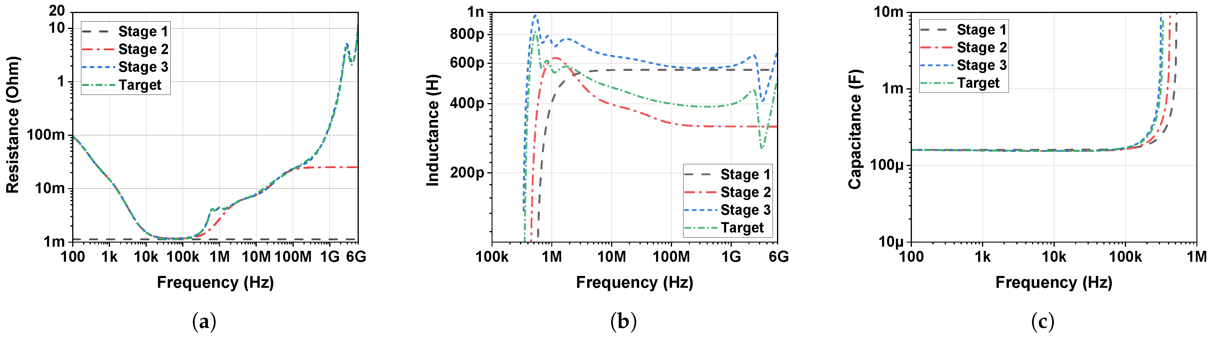 Figure 7a–c present the frequency-dependent resistance (R), inductance (L), and capacitance (C) characteristics extracted from the target impedance data [