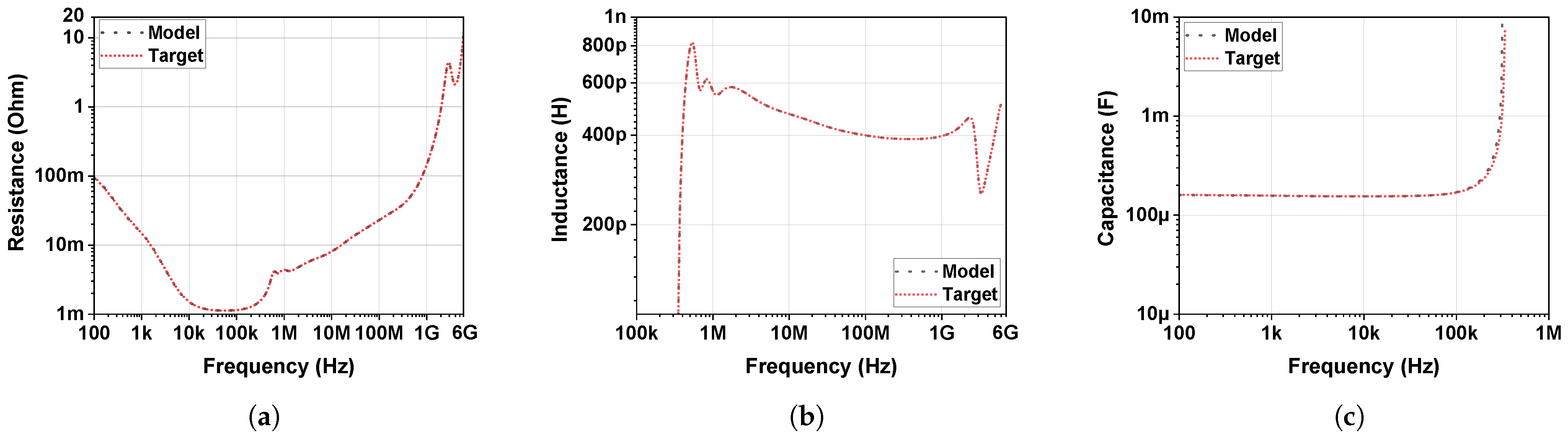 Figure 6 compares the model impedance characteristics of the proposed model with target data across the resistance (R), inductance (L), and capacitance (C) domains to verify the accuracy of the parameters in