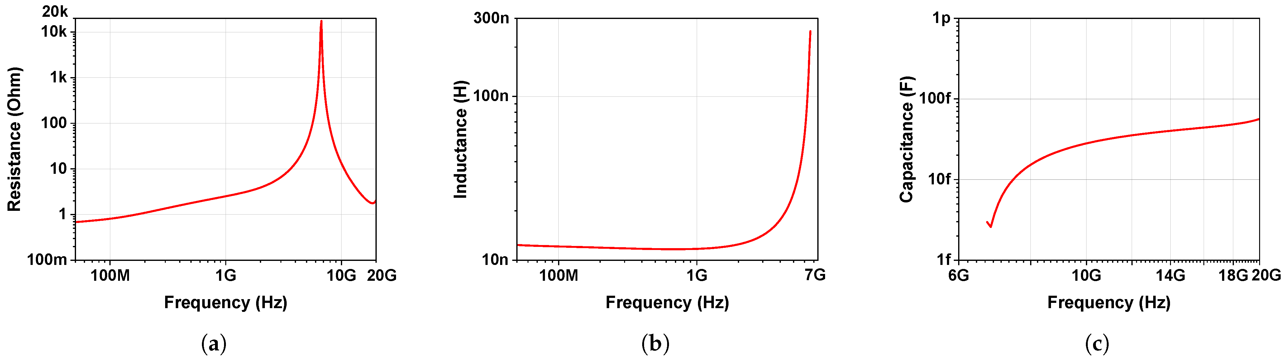 Figure 1a–c show the resistance (R), inductance (L), and capacitance (C) characteristics extracted from the impedance target data provided by Murata [