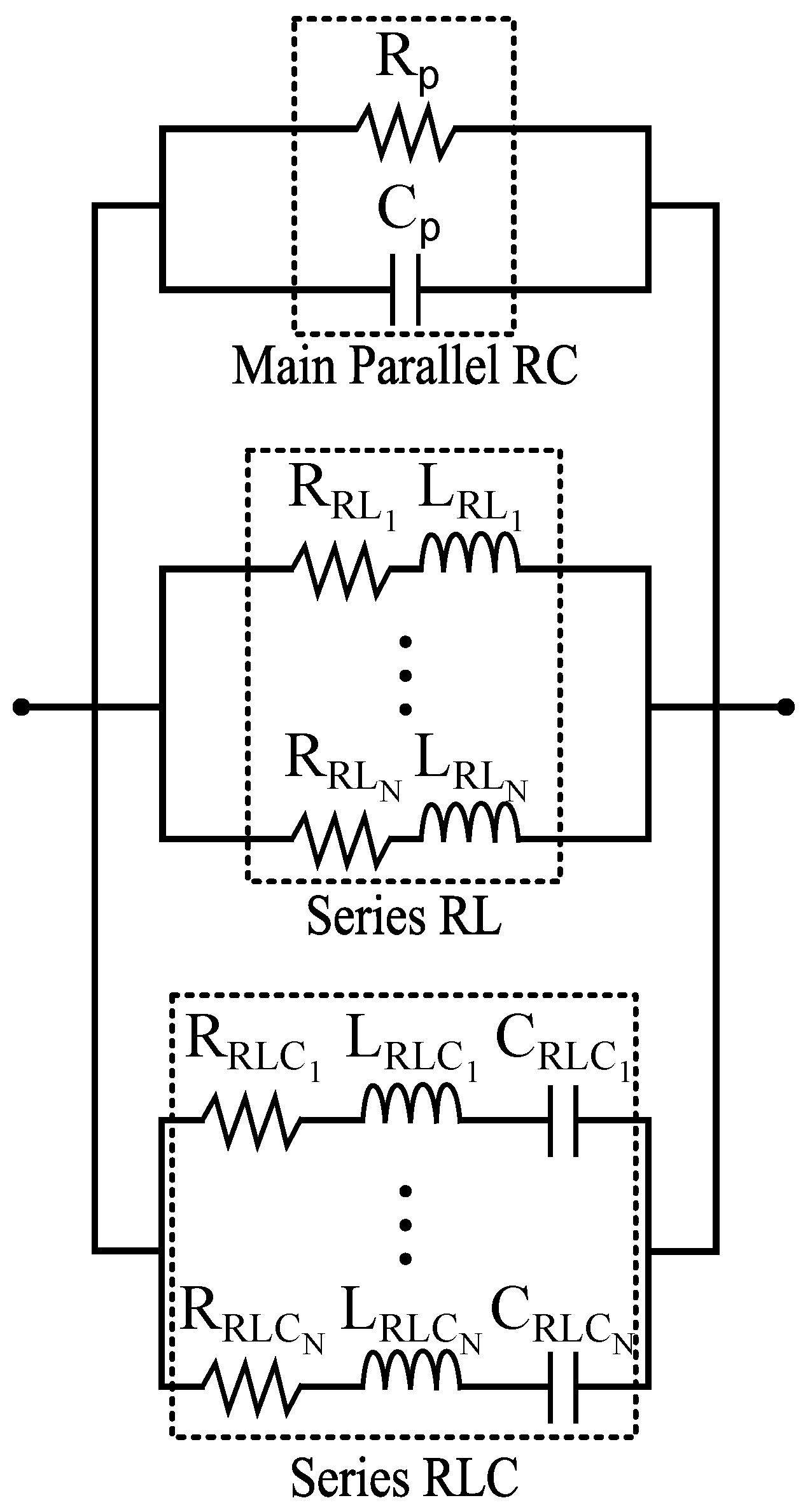 Figure 1a, a simple constant resistor cannot capture the decreasing trend observed in the target resistance characteristics. Therefore, multiple RC parallel branches are employed to flexibly approximate the frequency-dependent slope of the target resistance in this region. The parallel RC topology functions as a low-pass filter for the resistive component, effectively capturing the frequency-dependent attenuation associated with dielectric loss. At low frequencies, the capacitor acts as an open circuit, forcing current to flow through the resistor (maximizing resistance). In contrast, at high frequencies, the capacitor has low impedance, effectively suppressing the resistance and causing the total real impedance to drop, accurately reflecting the behavior of dielectric losses.
