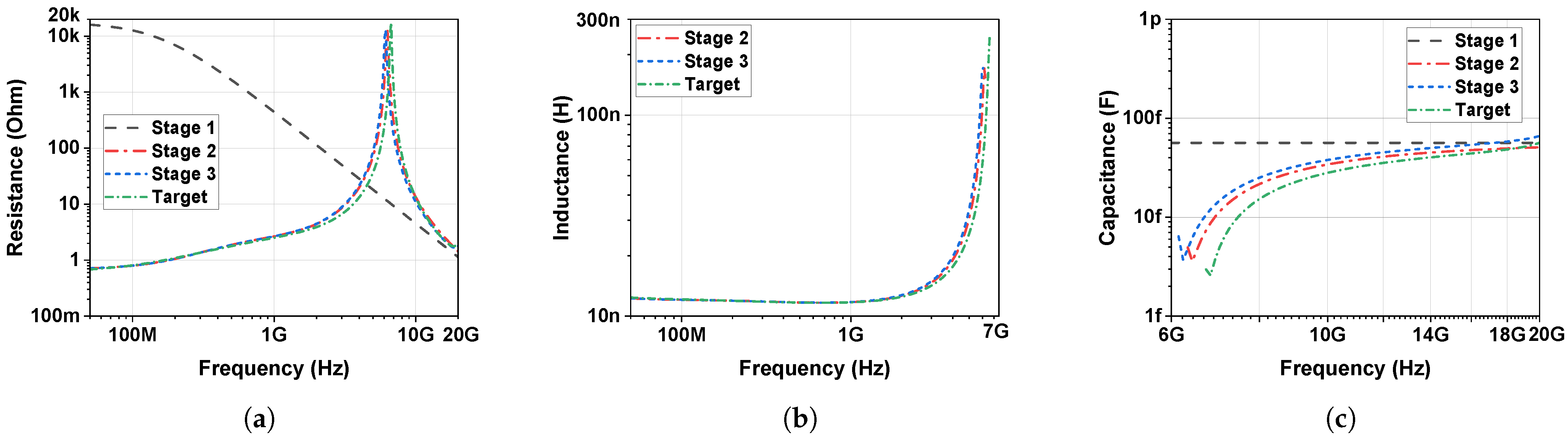 Figure 10. As shown in the graphs, stage 1 defines the fundamental resonance (SRF), and stage 2 matches the rising slope in the resistance graph. Finally, stage 3 captures the secondary resonance, which appears as a sharp peak in the high-frequency region.