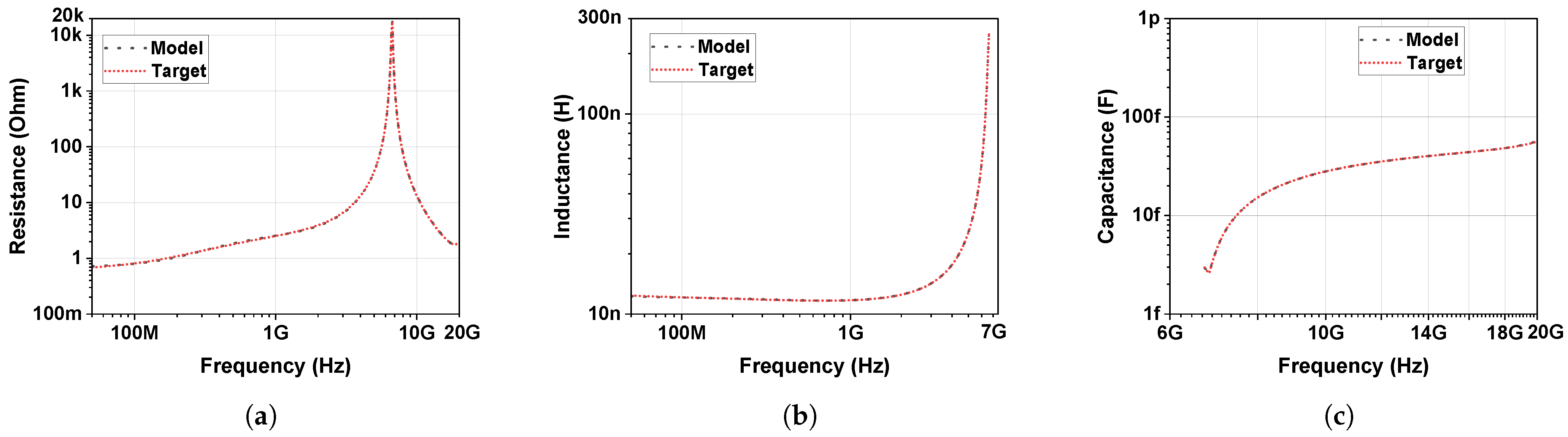 Figure 6b,c. In addition, the parallel RLC tanks allow the model to follow the sharp knee resonances. The close match between the proposed model and target confirms that the proposed systematic extraction method yields a highly accurate model.