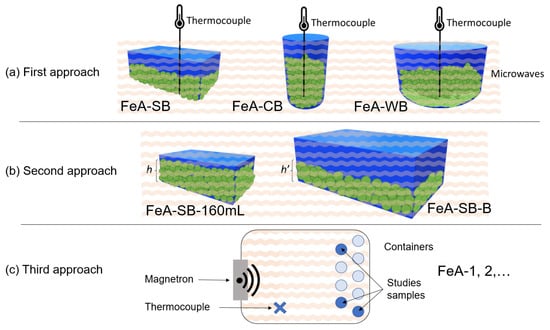 Scheme of the three strategies studied for microwave-assisted sol–gel synthesis: (a) evaluation of the influence of the shape of the vessel, (b) evaluation of the influence of the volume of the vessel, and (c) evaluation of replicating vessels on the microwave cavity.
