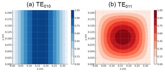 In order to have a uniform field inside the cavity, the microwave device used in this work has wave diffusers trying to homogenize the energy inside the cavity. Moreover, since the microwave is designed as a waveguide rather than a fully enclosed cavity, the fundamental dimensions for field propagation are transversal to the propagation axis. This implies that not all modes are capable of carrying energy. Therefore, although the TE001 mode exhibits the lowest cutoff frequency, it has a longitudinal component ( = 1) that prevents efficient energy transmission through the waveguide. Consequently, the mode TE010 carries the maximum power efficiently and features a symmetric field pattern as shown in Figure 2a.