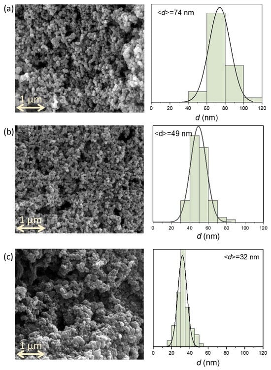 SEM images and cluster size distributions of FeA synthesized in containers with the same volume but different shapes: (a) square base (FeA-SB), (b) cylindrical base (FeA-CB), and (c) wide cylindrical beaker (FeA-WB).