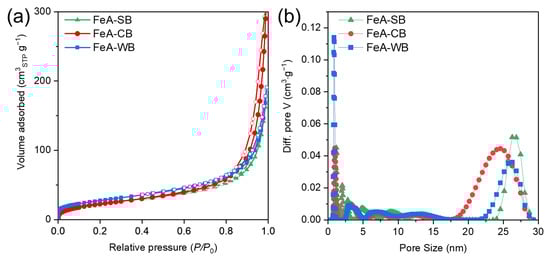 N2 adsorption–desorption isotherms have been performed to evaluate textural properties (Figure 4a). All samples show Type II- isotherms according to IUPAC classification [31], indicating that the aerogels are mainly macroporous with a low presence of meso- and microporosity. However, some differences can be observed within the micro-mesoporous range. Although all samples appear to exhibit quite similar volumes of micropores (i.e., 0.03–0.04 cm3 g−1), the volume adsorbed at low relative pressures increases in the following order: FeA-SB > FeA-CB > FeA-WB. This results in a slightly higher BET surface area (82, 84, and 86 m2 g−1 for samples FeA-SB, FeA-CB, and FeA-WB, respectively). This trend is in agreement with the nodule sizes determined by the SEM images, as a larger number of small nodules gives rise to higher surface areas. On the other hand, the same trend is observed in the external surface area (Sext = 81, 82, and 82 m2 g−1 for samples FeA-SB, FeA-CB, and FeA-WB, respectively).