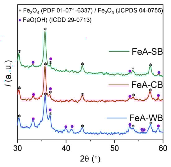 The diffractograms show minor changes in crystallinity, related to the morphology developed in the samples studied; consequently, the chemical composition remains unchanged. The three samples present a mixture of iron oxide phases. However, the intensity of these phases seems to change, the non-magnetic phase FeO(OH) being more intense for FeA-WB than for FeA-SB and FeA-CB. Crystalline sizes were calculated using the Scherrer equation. The first three most intense peaks were selected to avoid the splitting of the Kα1 and Kα2 lines and to minimize instrumental error. FeA-SB exhibits nanocrystals with an average size of 30.8 nm, while FeA-CB and FeA-WB contain nanocrystals of 29.7 nm and 29.5 nm, respectively. These values corroborate the wider sizes detected for FeA-SB in SEM images.
