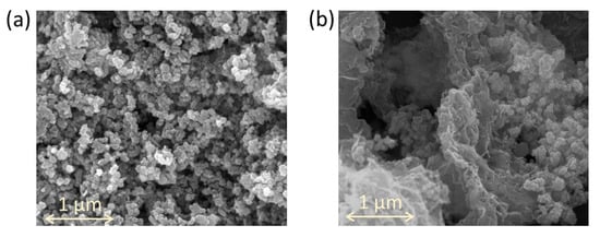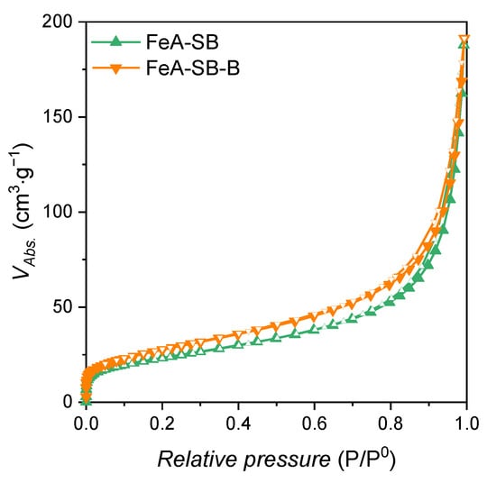 Regarding the porosity developed by these samples, if the N2 adsorption–desorption isotherms are compared (Figure 7), it can be seen that there are only some slight differences between both samples. The sample FeA-SB-B presents slightly higher adsorbed volume at low and intermediate relative pressures, indicating a higher volume of micro- (0.033 cm3 g−1 vs. 0.029 cm3 g−1) and narrow mesopores, respectively, than FeA-SB. However, the total volume adsorbed at the saturation point is quite similar (ca. 0.29 cm3 g−1), indicating a similar total porosity due to similar mean nodule size in both cases (ca. 70 nm).