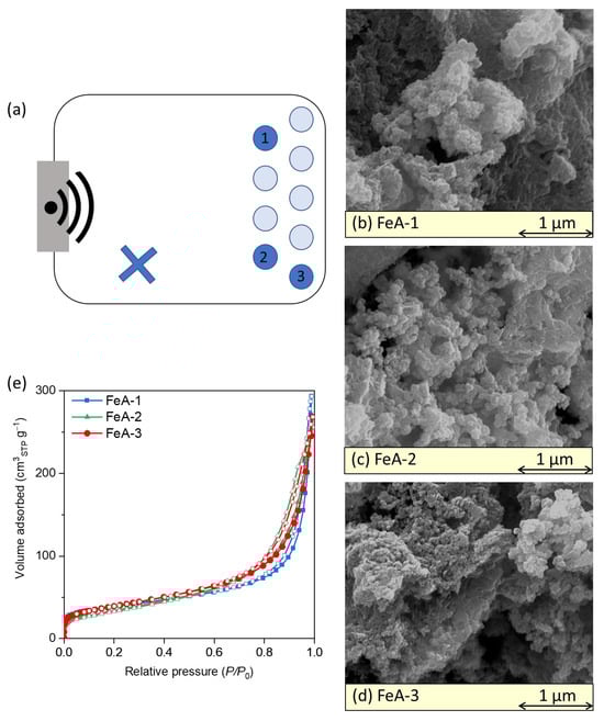 Samples FeA-1, FeA-2, and FeA-3 exhibit a nodular structure with no significant differences between them (Figure 8b–d). However, these nodules seem to be fussed in comparison to the aerogels obtained from Section 3.1.1 and Section 3.1.2 discussed above. This could be due to the different heating processes undergone. In fact, these FeA-1, -2, and -3 nanomaterials were not heated adequately because they are not centered in the microwave cavity. Therefore, the nodules are not sufficiently cured, and in these cases, the final aerogel structure may collapse during drying. This change in morphology obviously has an effect on the textural properties of the nanomaterials obtained, as shown in Figure 8e.