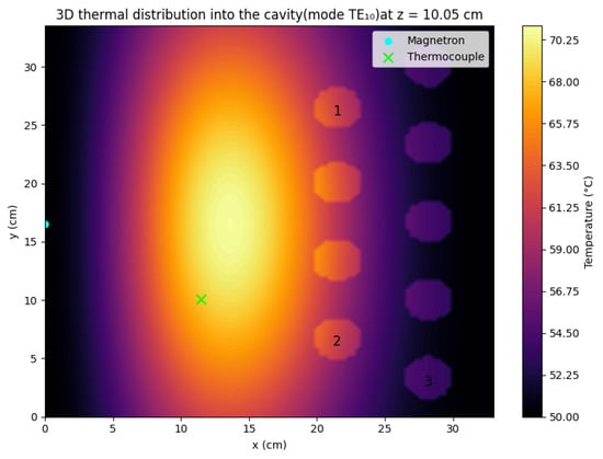 Temperature mapping inside the microwave cavity considering the TE10 mode. Magnetron, thermocouple, and vessels are also represented.