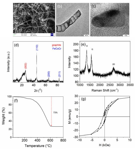 (a) SEM image of the FeCoCr@CN sample, (b) TEM of the N-doped carbon nanotube structure, (c) FeCoCr alloy nanoparticle present at tips of the nanotubes. Reproduced with permission from ref. []. (d) XRD, (e) Raman spectrum, (f) TGA, and (g) VSM measurements for the FeCoCr@CN sample.