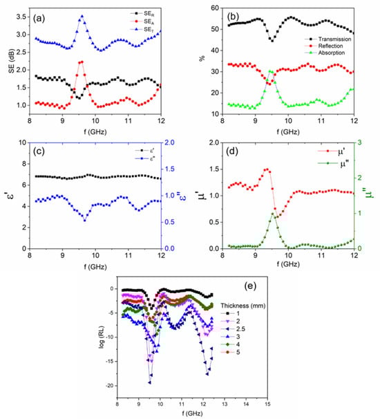 Variation of (a) SE, (b) %transmission, reflection and absorption coefficients, (c) complex permittivity, (d) complex permeability, and (e) log(RL) with respect to frequency in the X-band of the microwave.