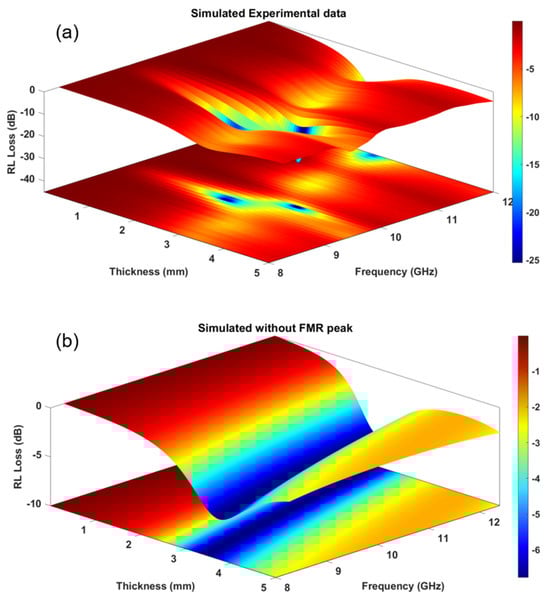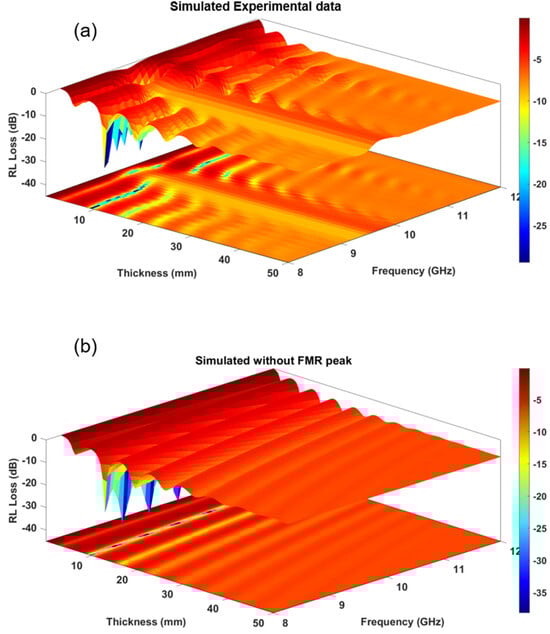 Simulated RL plots using experimental data for a thickness range of 0.01–5 mm: (a) with FMR contribution and (b) without FMR peak contribution.
