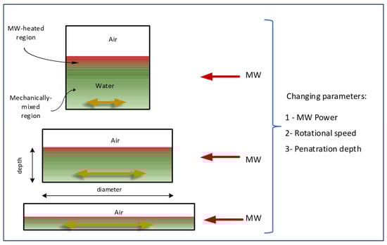 Microwave (MW) reactors are used in various applications, such as organic synthesis [1], food processing [2,3,4,5,6], materials science [7,8], chemical conversion [9], distillation [9] and chemical engineering [10]. One of the advantages of microwave heating is its ability to heat suitable reaction mixtures quickly, resulting in improved reaction efficiency and selectivity. However, the heating efficiency of a microwave reactor depends on several factors, such as the reactor design and the power input. While higher microwave power inputs can increase the heating rate, they can potentially generate overheating or thermal runaway. In addition to localised “hot spots” [11], non-uniform temperature distribution can reduce reaction conversion and generate undesirable by-products [12]. Thus, predicting and improving the uniformity of temperature distribution is one of the critical issues of microwave applications [13,14].