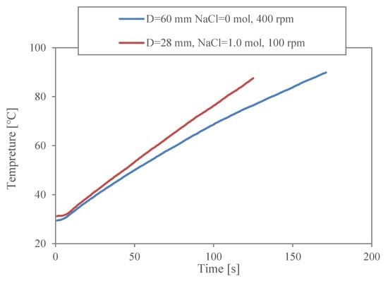 Figure 3 shows two examples of the temperature profile at different operating conditions. It can be seen that the temperature rising rate varies with the stirring speed and NaCl concentration. In the case of high NaCl concentration (C = 1 mol/L), the heating rate is faster. Accordingly, the solution reached a boil quickly. Time until boiling, tb, was confirmed from the movie. An induction period is observed between the start of microwave irradiation and the rise in the temperature of the bulk sample. The heating rate, r [K/s], was calculated as the slope of the temperature from induction time to boiling time.