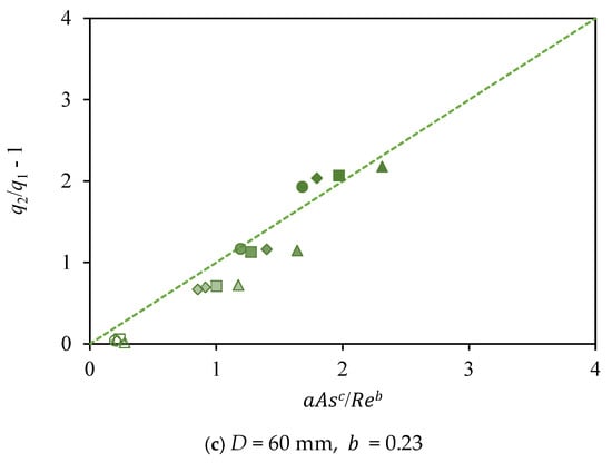 Fitting of experimental data and correlation of Equation (5) for different cylindrical vessels (for all vessels, = 0.065 and = 1). The shape of symbols corresponds to the rotational velocity (Δ: 100 rpm, □: 200 rpm, ◊: 300 rpm and o: 400 rpm). Filling colours correspond to the NaCl concentration (0, 0.1, 0.5 and 1 mol/L).