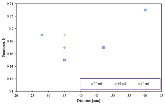 To highlight the relationship, the best-fitted values of are plotted versus the diameter of cylindrical vessels in Figure 5. It can be seen that the combination of 35 mm diameter and 30 mL of the solution produced the lowest value of b. In Equation (5), is the total heating energy of the liquid volume, and is the energy supplied by the microwave to the outer layer (to the penetration depth). The ratio represents the degree of mixing between the heated (outer) and non-heated (inner) regions. A smaller / ratio means the heating is more uniform. Larger / means most microwave-supplied energy remains in the outer layer. For a cylindrical shape, as the diameter increases, the depth-to-surface area ratio decreases. Consequently, the relative influence of mixing and heating also changes. Since the length and thickness of the stirrer were fixed (24 mm and 6 mm, respectively), the shape factor influenced the heating. When the water body is very deep, the top region of the solution is not well-mixed, as demonstrated in Figure 1a. In contrast, if the water body is very wide in comparison with the mixer, the region near the wall is not well-agitated. Consequently, an optimal ratio will exist where the heating effect is maximised [8] and closest to uniform: this state is a combination of good mixing and a large absorbing volume. For a 30 mL volume, the heat distribution is optimised with the 35 mm cylinder (the corresponding solution depth is 31.2 mm). Provided that good mixing can be achieved, the most effective diameter/depth ratio is about 1:1, where the surface area to volume ratio is optimal to maximise the absorbing area.