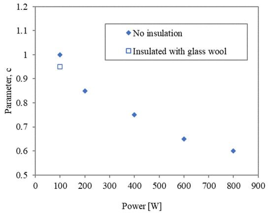 Finally, the formula is applied to different microwave heating under various irradiation powers, with and without insulation (Figure 6) at the same vessel shape (cylindrical shape of 35 mm-diameter) and volume (30 mL). For different powers and insulation, the values of and are constant. However, the value of c varied. With increased microwave power, previous results for the relation with microwave power [26] showed a decreasing trend. In this scenario, the heating power increased within the same microwave-absorbing region. Consequently, the relative influence of the surface layer in Equation (5) is reduced. It is noteworthy that the trend is not strictly linear. With the increased power, the irradiation time is reduced, and the temperature increases faster. Consequently, the temperature gradient and thermal convection increase and is reduced.