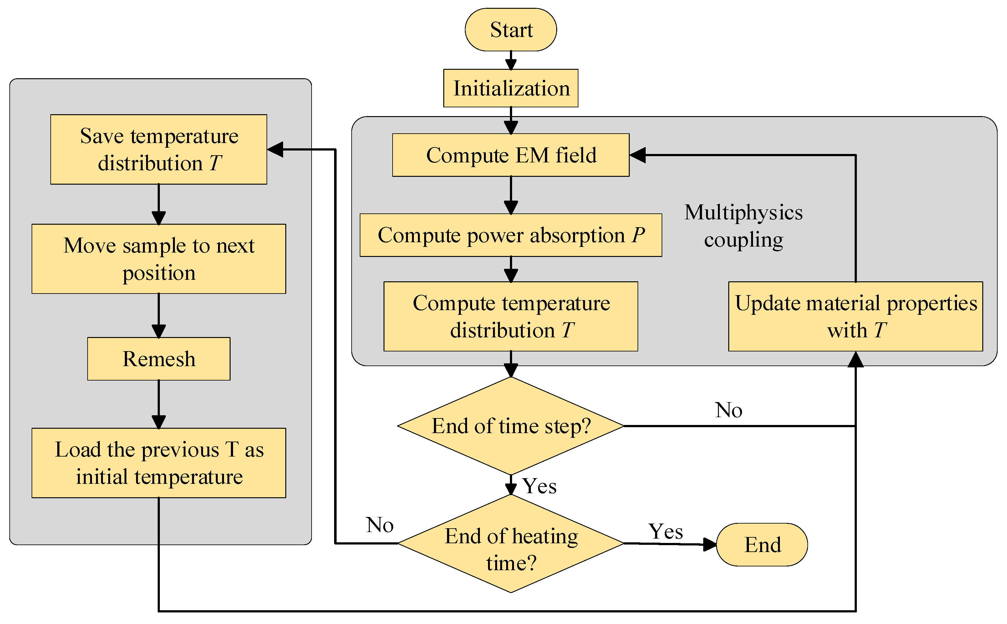 - Li, R.; Hong, T.; Liu, R.; Chen, H.; Yang, Y.; Zhu, H. Microwave Heating Multiphysics Computation of Moving Complex-Shaped Samples Based on Ray Casting Method. IEEE Trans. Microw. Theory Tech. 2025, 73, 2628–2639. [Google Scholar] [CrossRef]