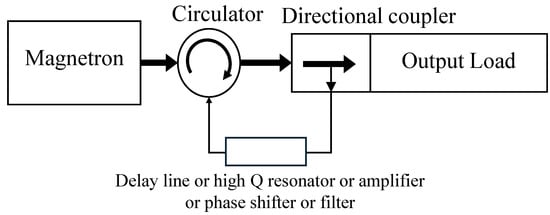 Self-injection locking stabilizes the magnetron by feeding a portion of its own output back through a delay line or resonant cavity. As illustrated in Figure 1, the structure and principle of typical self-injection-locked oscillators are analyzed in [55,56]. Phase stability in this configuration primarily depends on the electrical length of the feedback path and the oscillator topology. Reference [63] experimentally validated the effectiveness of self-injection locking for frequency stabilization and noise suppression in magnetrons. This approach incorporates a tunable high-Q cavity within the feedback loop, enabling flexible adjustment of the phase shifter. Reference [57] proposed a noise reduction in the self-injection to realize quasi-locking of the magnetron.
