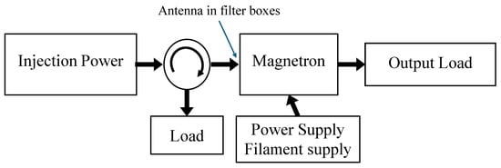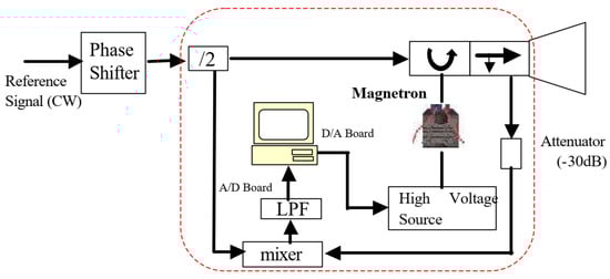 Free-running magnetrons are crossed-field vacuum electron devices that generate microwave oscillations and are widely employed in microwave heating, radar systems, and related applications [52]. In contrast, injection-locked magnetrons are predominantly utilized in MPT and high-power industrial heating systems requiring coherent outputs [14,53]. The operating principle of frequency- and phase-stabilized magnetrons closely resembles that of a phase–locked loop (PLL). A low-power, high-stability reference microwave signal is injected into the magnetron to counteract its inherent frequency drift, thereby establishing a stable phase relationship between the magnetron output and the reference [27,54]. By employing “quasi-PLL” techniques, a magnetron can be converted into a power amplifier with feedback, yielding an oscillator that exhibits both frequency locking and phase stability.